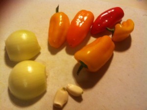 One of my favorite combinations is mini sweet peppers, onions and garlic.