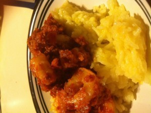 Once the vegetables started to turn a nice golden brown, I removed half of them from the pan into a separate pan for the chorizo. I added a splash more olive oil and one cup of rice. I stirred the rice in the oil and vegetables over medium-high heat until the rice started to turn a golden brown. I then added one cup of vegetable broth, and one cup of water. I brought this combination to a boil and then reduced the heat to simmer, stirring occasionally until the liquid was mostly absorbed. I then stirred in the cheese and continued to cook until the pilaf achieved a nice thick consistency.