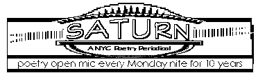 She is the founder and host of the Saturn Series poetry reading in it's 18th year every Monday night at Nightingale Lounge. She hosts the Artists' Lounge Music Showcase & Open Mic, also at Nightingale Lounge. Su is the set designer for the last 6 years of the New Years Day Poetry Extravaganza held at the Bowery Poetry Club. You can find her on Facebook and Myspace.