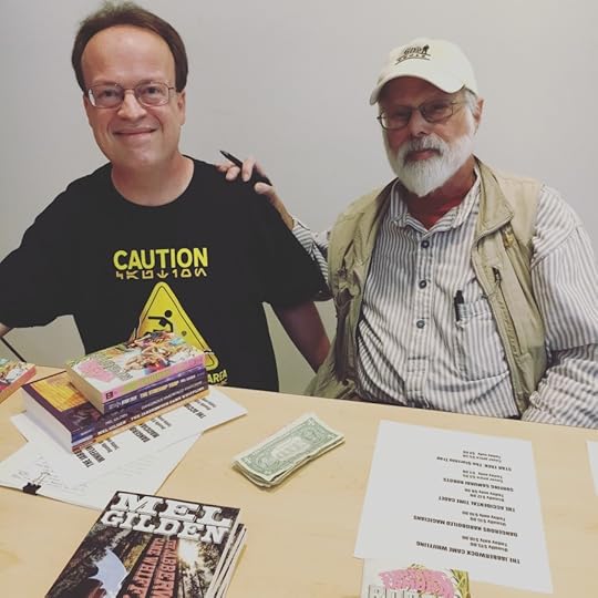 Mel had a wonderful childhood, and worried that this would not engender enough inspiration for good stories. Mel asked science fiction author Harlan Ellison what he should do, and Ellison told Mel to “write what you know.” As a result, Mel wrote the horror story “The Bridge is Out. You’ll Have to Spend the Night,” which is based on Mel’s relationship with his little brother. Mel followed up this story with a story inspired by The Twilight Zone that he sent to a potential publisher. Then he waited for a reply. “There is a lot of waiting involved if you are a freelance author,” Mel says. Finally, Mel received a letter announcing the magazine he sent the story to had gone out of business. Mel’s reaction was “oh my gosh, I murdered a magazine!” Mel’s first professional sale was the short story “What About Us Grils?” (which he wrote at the Clarion Science Fiction Writers workshop in Pennsylvania). The story is about an alien species with four genders. Mel has had interesting encounters with his fellow science fiction writers. One day, Mel visited the Santa Monica Public Library and saw a man wearing shorts and sitting on a wall. The man was legendary science fiction author Ray Bradbury. Ellison and Kate Wilhelm were two of Mel’s instructors at the Clarion workshop. Ellison is “not the easiest guy to get along with,” but Mel has a good relationship with him: “There are a lot of things you can get away with if he likes you and trusts you.” Mel once visited the home of Bob Burns, a collector of science fiction film memorabilia. Burns invited Mel to sit in the time machine prop from the film The Time Machine (based on H. G. Wells’ novel). A photo of Mel in the time machine appears on his website ( www.melgilden.com ) and on the dust jacket for Mel’s novel The Pumpkins of Time.