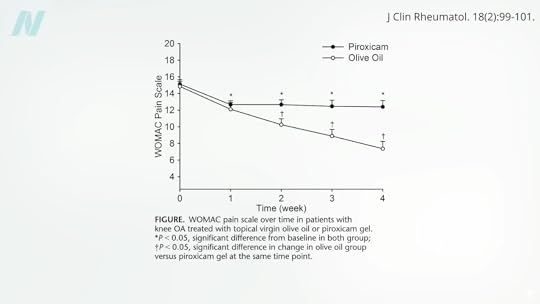 Topical virgin olive oil went up against a gel containing an ibuprofen-type drug for osteoarthritis of the knee in a double-blind, randomized, clinical trial. Just a gram of oil, which is less than a quarter teaspoon, three times a day, costing less than three cents a day, worked! Topical olive oil was significantly better than the drug in reducing pain, as you can see below and at 4:37 in my video.