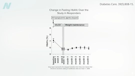 A large enough calorie deficit can cause a profound drop in liver fat sufficient to resurrect liver insulin sensitivity within seven days. Keep it up, and the calorie deficit can decrease liver fat enough to help normalize pancreatic fat levels and function within just eight weeks. Once you drop below your personal fat threshold, you should then be able to resume normal caloric intake and still keep your diabetes at bay, as seen below and at 4:05 in my video.
