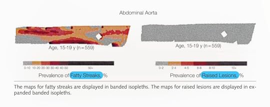 The plaques started appearing in their abdominal aorta in their early 20s and worsened by their late 20s, by which time fatty streaks had infiltrated throughout. By their early 30s, their arteries were in bad shape, as seen below and at 1:25 in my video.