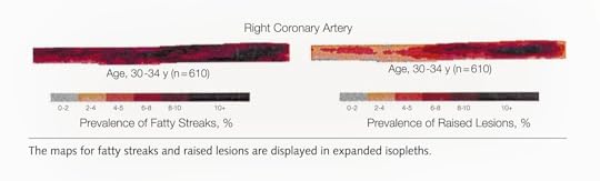 Researchers found the same pattern: fatty streaks in teens, early signs of plaque in early 20s that progress with age, and by the early 30s, most people already had plaques in their coronary arteries, as seen below and at 1:47 in my video.