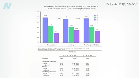 They also found significantly lower odds of metabolic syndrome and high blood pressure. There were only about half the odds of being diagnosed with hypertension over a three-year period among those eating more healthy plants. Even mental health may be impacted—about 80% less depression, 2/3 less anxiety, and 70% less psychological distress, as you can see below and at 5:15 in my video.