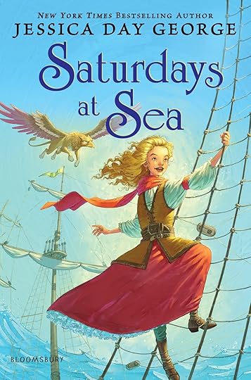 Princess Celie has climbed partway up the shrouds of the magical Ship, the Golden Griffin, to look out over the tossing sea. She is wearing sturdy boots and a leather waistcoat over her red skirt and white blouse, and has a long red scarf around her neck. Her griffin, Rufus, flies above her, keeping watch for land and looking intense.