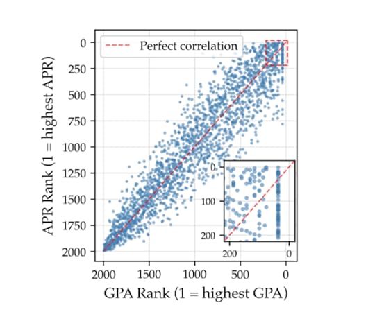 You can actually see this in the faculty’s own dataset. They propose using APR (average percentile rank) rather than GPA for internal awards. That just means you get a score that averages your rank in each class; if you get the median grade, you get 50, whether that grade was a B or an A- or an A. Look, they say, this is highly correlated with GPA, but no grade inflation!