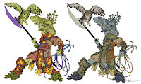 Then on the right you can see where I landed with my final base color choices. There were many variations in between (going with red/orange for the mushroom bits and green for the armor. Then back to green mushrooms with warmer brown leather...until I got to this blue and green combo I was pleased with. At this stage I also established color holds (areas where I want the inkwork to be a color other than black) for the mushroom spots on his skin and for the outlines of the armor lichen.
