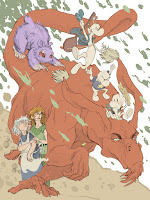 When I received the invitation email I knew right away that I wanted to draw the Red Dragon from the series. And while thinking about what else from Bone I'd love to draw, Bartleby (the baby rat creature the Bones adopt) came to mind––but it would be strange to have him without at least Smiley Bone...which kinda meant I was including all the Bones...and they would all be hanging on for dear life to the dragon as he charges ahead.
