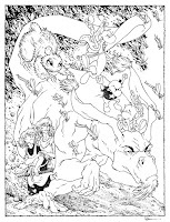 I'll admit, this piece was hard to manage so the viewer could still focus on the characters while being able to get lost in the objects. The rendering was all done with the dodge and burn tools in Photoshop with a stock textured brush. I forgot to mention on the step above, I added a color hold (where I want the ink lines to be a color other than black) to the trees in the background as well as the ground as it recedes into the background on the left.