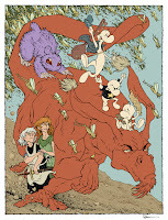 The first step of digitally coloring a piece is do establish the color areas with flat colors (a professional version of coloring-in-the-lines). Here the final color palate isn't as important as being able to easily isolate any part of the piece when it comes time to render it (like being able to grab just the mouse's fur or just the cooking pot, or the sword in the magpie's beak, etc)..so while I got the backgound and figure colors close to final in this step, with all the bits of the mouse's collection overlapping each other, I needed to abstract that and just do vibrantly wrong colors to be sure I got everything and enough separation between them all. Final Render:
