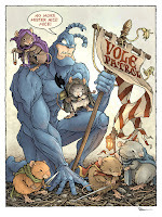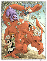 The inks were scanned and I started digitally coloring the piece. This involves blocking in flat colors to establish each color's shape. Most of the color choices had been made by reference to the Jeff Smith comics (with colors by Steve Hamaker) and from my layout.