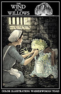 Toad getting disguised by the jailer's daughter as a washerwoman to escape prison.https://davidpetersen.blogspot.com/2016/12/wind-in-willows-washerwoman-toad-color.html