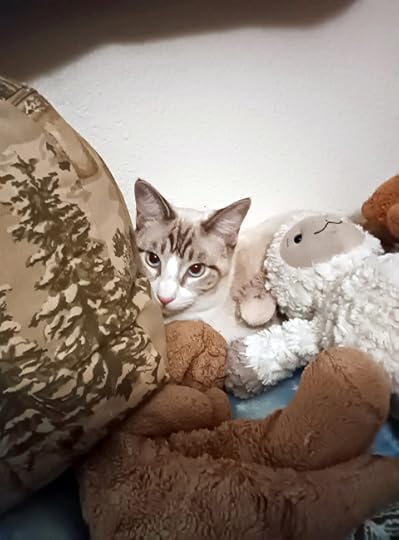 They’re nearly full-grown now and very, very sweet in different ways.  Cascabel is turning in to quite the cuddler, and if humans aren’t available stuffy toys will definitely do!