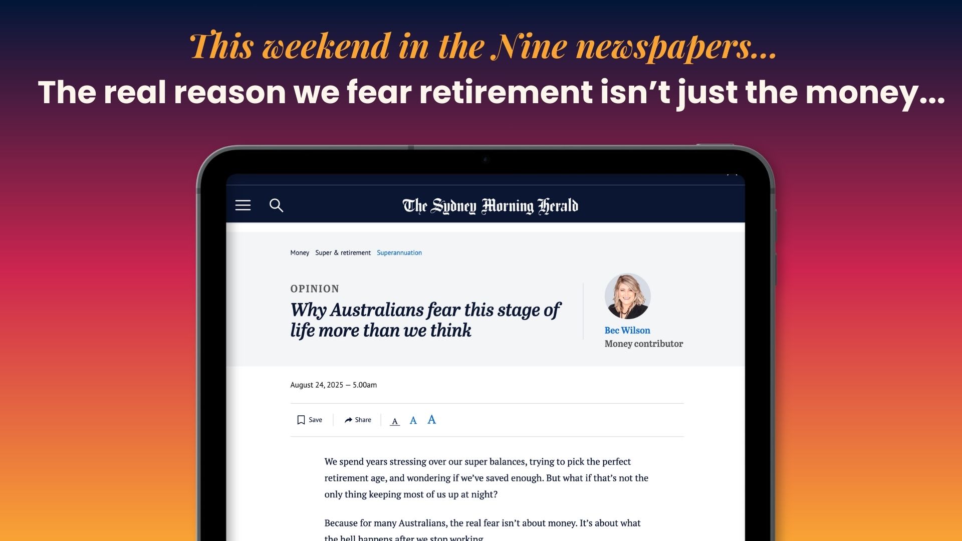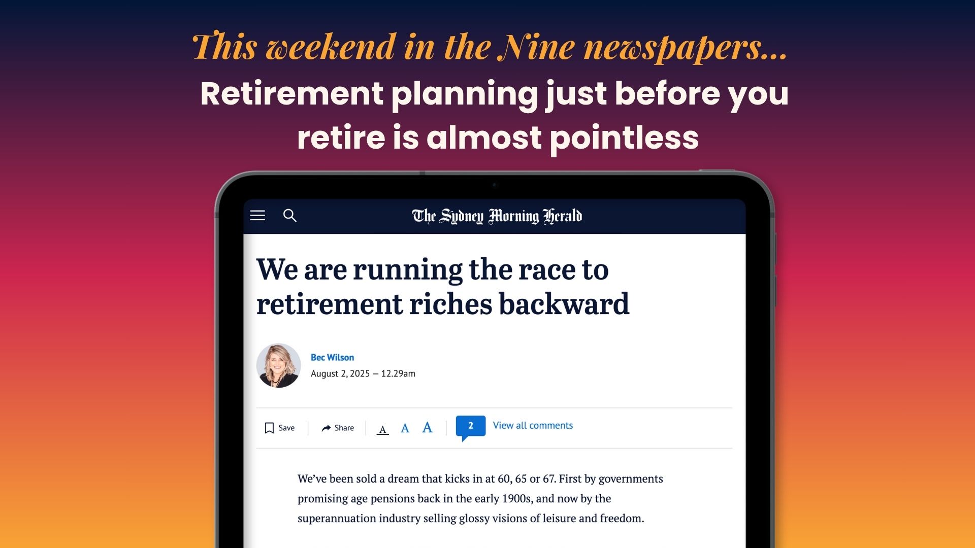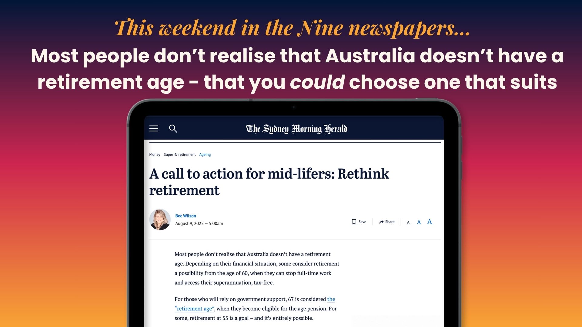 Extract of the national article kicking off The Epic Retirement Tick published in print and digital in The Age, The Sydney Morning Herald, Brisbane Times, WA Today on Sunday 17th August 2025.