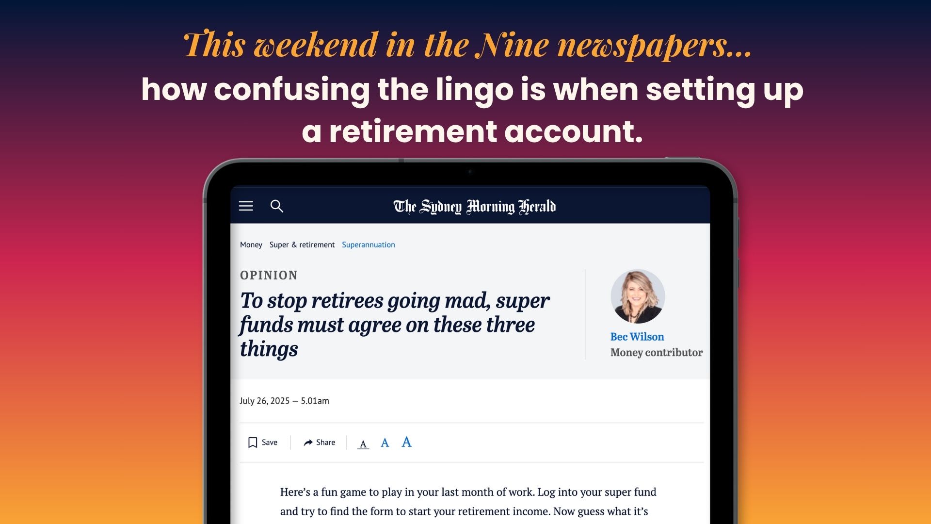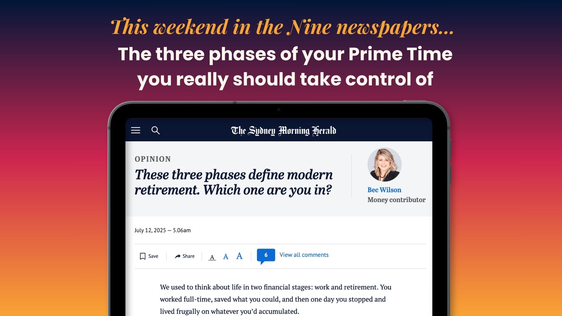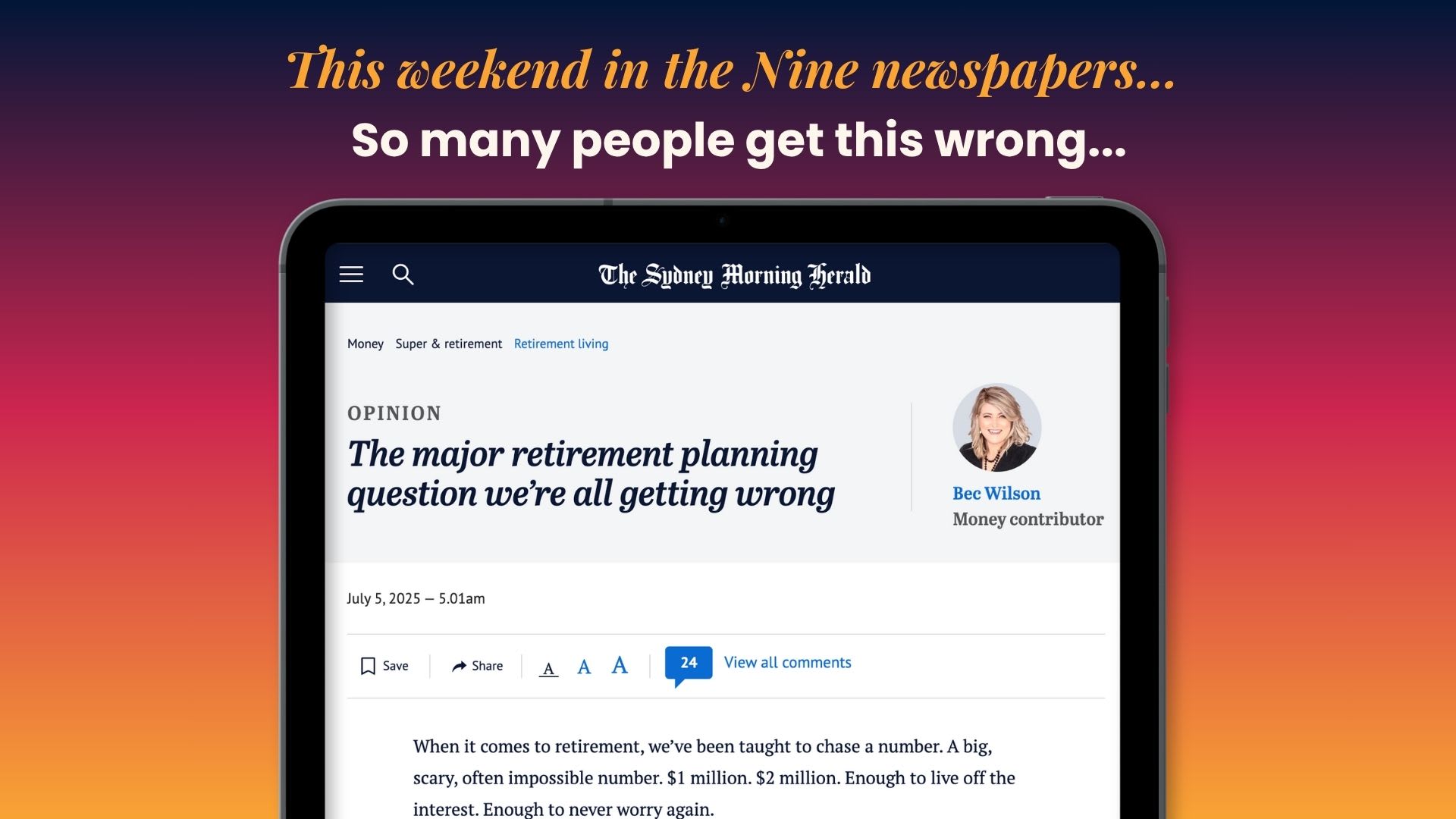Extract of the national article kicking off The Epic Retirement Tick published in print and digital in The Age, The Sydney Morning Herald, Brisbane Times, WA Today on Sunday 17th August 2025.