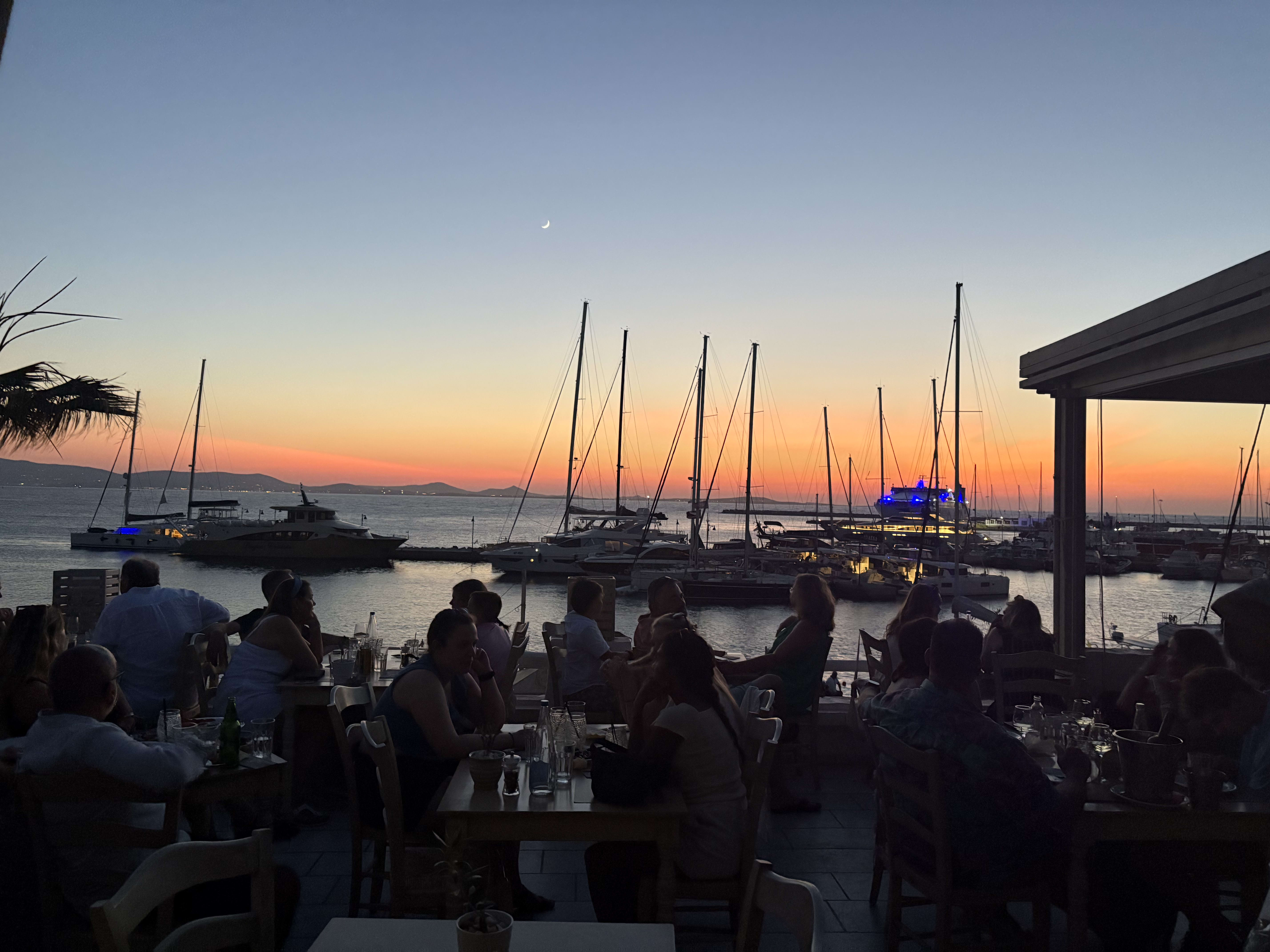 Last night, the power went out across the whole town just as we sat down to dinner. Total blackout. Waiters rushed (not very quickly) around with candles, and we just laughed. Polly had explained to us when we asked what was going on, that Greek island power really struggles when there’s too many tourists and too many hot days combined, and that when it goes out, no one’s in a rush to flick the switch back on. So we ordered souvlakis and salads — things they could grill over gas — and soaked up the golden-pink sunset at 9.30pm. (Honestly… I wish we got sunsets like that in Queensland — bloody daylight saving 🙄!)