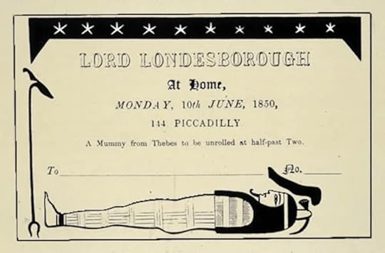 Mummy party invitation, available on the internet, source unknownThe mummies, sadly, weren’t difficult to obtain. The common people of ancient Egypt were interred in niches in mass graves, and enterprising Egyptians 3,000 years later were happy to dig them up and sell them – or, if desired, tourists could climb down and choose their own, like a lobster in a tank.