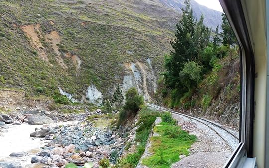 In Peru, we snaked along the unruly Urubamba River, watching clouds lower onto the tops of the surrounding Andes mountains. In places the track had been cut through the rock and we edged along sheer faces of it or through narrow tunnels. Next there might be a small grove of banana trees, or stands of prickly pear cacti. Periodically we’d pass a train making the return trip from Aguas Calientes, the town at the base of Machu Picchu, as well as piles of sacks of potatoes (waiting for transport by a more utilitarian train) and a few stacks of construction materials.