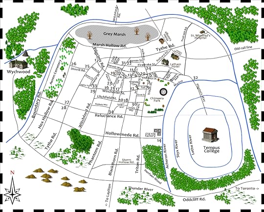I drew detailed maps of the weird little town of Llithfaen, where much of the action in the trilogy takes place, and of the Tempus College campus, in MS PowerPoint.