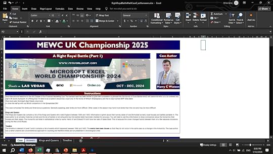 Excel tournament sample intro (from the UK website)Competitors are given files of data and scenarios or ‘cases’ to sort though to answer a specific question, in the shortest amount of time possible. At the start of the first round they all receive an Excel file at the same time. They then have a 30-minute window to answer as many questions in that file as they can. They face five or more levels of questions of increasing in difficulty. There are also bonus questions. Each question is worth a certain amount of points, and the winner is the person with the most points.