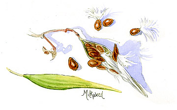 And this, the clever milkweed.I don’t grow impatiens from seeds, but I do love playing with the seed pods. The tiniest brush and POP! the pillow explodes, turning inside out, sending seeds everywhere. Clever strategy. Like the milk weed – each seed comes equipped with its own fluffy white parachute. A gust of wind and off he goes, sailing who knows where.