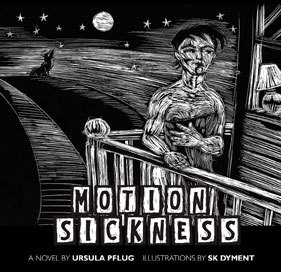 A picaresque miniature, Motion Sickness describes a young urban woman’s bewildering adventures on the verge of the real as she learns to trust friendship, and finally, love.This little book is a winner. Each of the facing pages forms a delightful and inextricable unit: a starkly-incised illustration and a 500-word chapter, with titles that read like a poem.Ursula Pflug’s voice is unique, funny and tough, and the dialogue is so exact it can be heard. SK Dyment’s dark and whimsical illustrations play with and enhance the tersely visual prose.