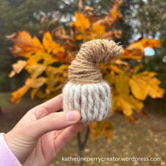 A creative way to add more pumpkin decor to your home, lol! What I like about making these mini pumpkins is that they don’t take that long to make and gathering supplies for them can be easy. My yarn pumpkins were a modified pattern from what I have seen going around so that I could make do with what I had. First, I cut a paper towel roll to the height I wanted for my pumpkin, and then I hot glued a few layers of aluminum foil to the inside of the roll so that the opening wouldn’t be as wide. Next, I used hot glue to attach the end of a yarn strand to the inside of the roll to hold it in place. Then I wrapped the roll with the yarn and hot glued down the end of the yarn strand. To make the stem, I shaped some aluminum foil in a stem-like shape and hot glued it to the yarn pumpkin. After that, I used hot glue again and wrapped jute around the foil.