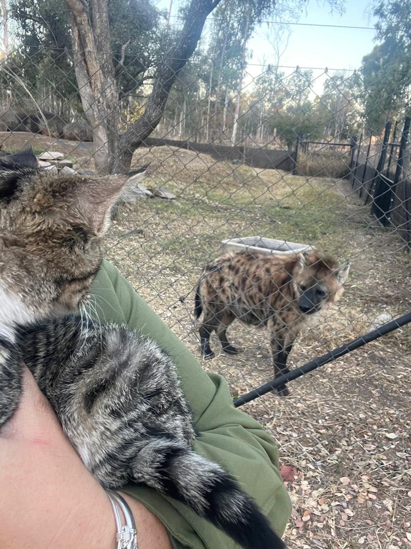 Photo: on tour. Unlike most most domestic tabby, this one has daily encounters with some pretty frightening beings - fortunately on the other side of diamond mesh