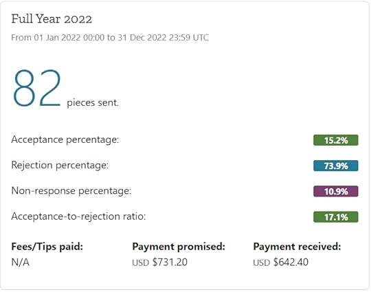 Although 2021 wasn’t a terrible year for submissions, I definitely went into 2022 hoping to improve, and in some ways I did. Mostly, though, I kind of held course with a solid but not exceptional year. There’s nothing wrong with that, but it was definitely one of those years where I felt like I was just treading water in a lot of ways. (Spoiler alert: 2023 will show me the error of this thinking.)
