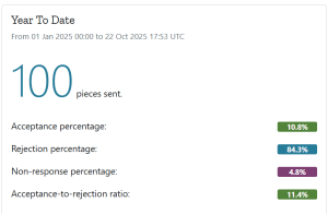 August 2025 Short Story StatsSubmissions Sent: 10Rejections: 4No Response: 1Acceptances: 1Further Consideration/Shortlist: 0Withdrawals: 0Pending: 14New Stories: 1