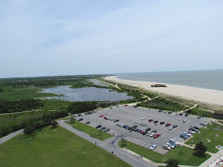 Stepping out onto the platform at the top was a whole different kind of scary. So high up, the shore winds are strong, and the metal no longer feels like metal, solid, but thin, and amazingly fluid. And if you step to the railing, which seems unbelievably flimsy, you can lean over. You can look straight down.