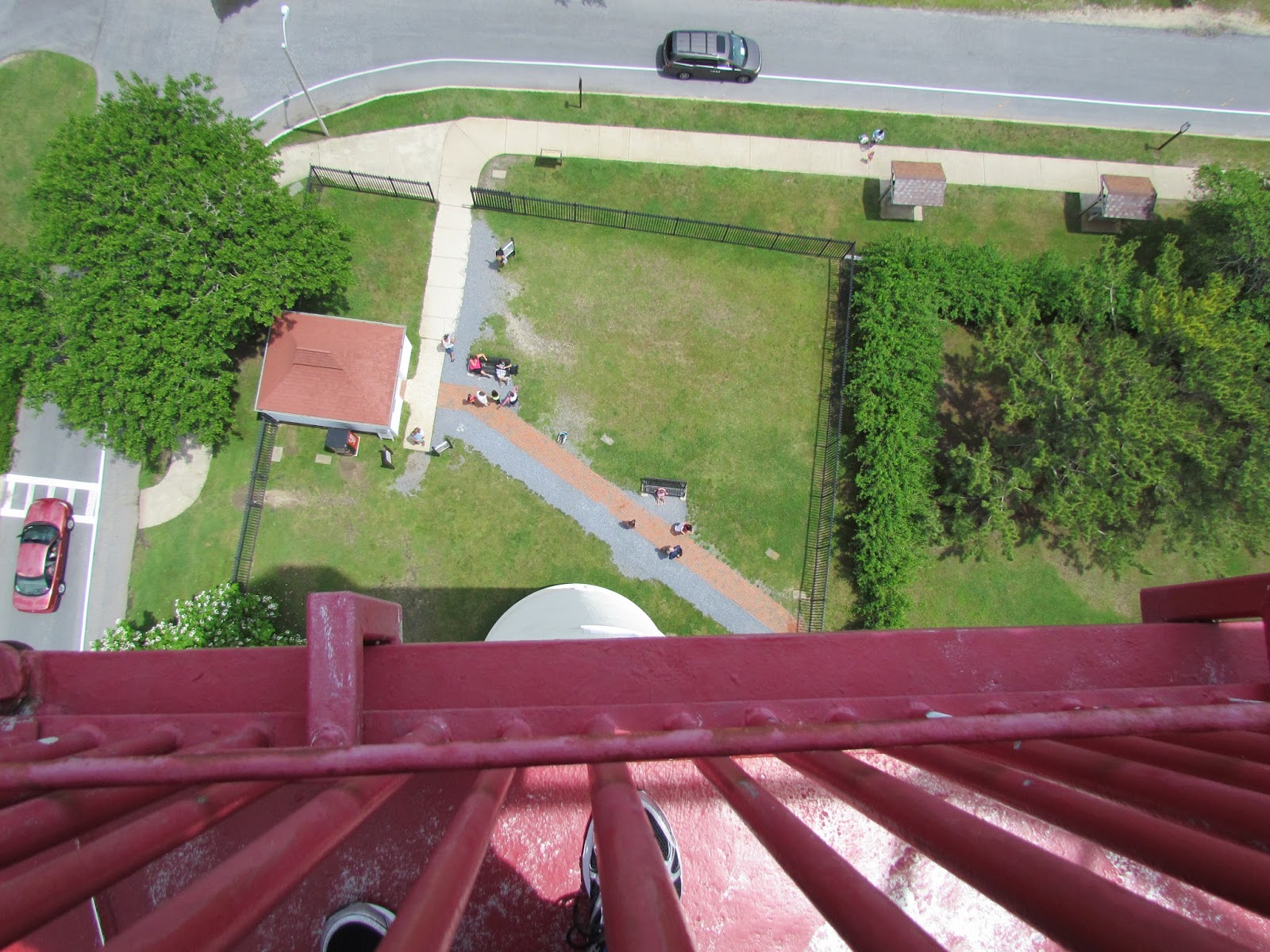 Stepping out onto the platform at the top was a whole different kind of scary. So high up, the shore winds are strong, and the metal no longer feels like metal, solid, but thin, and amazingly fluid. And if you step to the railing, which seems unbelievably flimsy, you can lean over. You can look straight down.