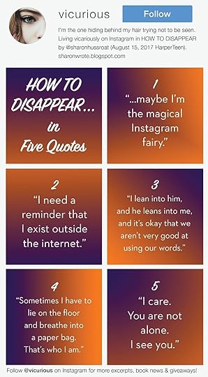 From Sharon Huss Roat: HOW TO DISAPPEAR doesn’t come out until August, so I thought it might be fun to share five of my favorite quotes to give a sense of the main character, Vicky, and what the book is about. Since social media plays a big role in this story, I’ve presented the quotes in an Instagram-style graphic, featuring the main character’s user name, Vicurious.