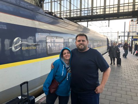 Next morning, six of us—Mathew, me, his parents, and his brother plus fiancé, hopped a Eurostar at St. Pancras, another well-worn next step in travels in this part of the world. But we were on a new trajectory for the now almost quarter-century-old trans-Channel rail line, one that previous required a transfer but can now be undertaken in a single three-and-three-quarter hour journey: Amsterdam.