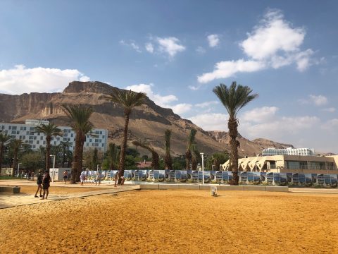 Although the Dead Sea isn’t what it was, the southern branch of the ultra-saline lake has been crisscrossed by levees and has water diverted to it by aqueducts to retain its size and composition. This serves the needs of industry to its south, which continues to mine the place for minerals; and for the ever-hungry tourist business, for which a new colony of hotels and beaches in the town of Ein Bokek was largely developed in the 1990s. We made our final stop there for yet another iconic activity of the region: a dunk in the briny waters of the sea.