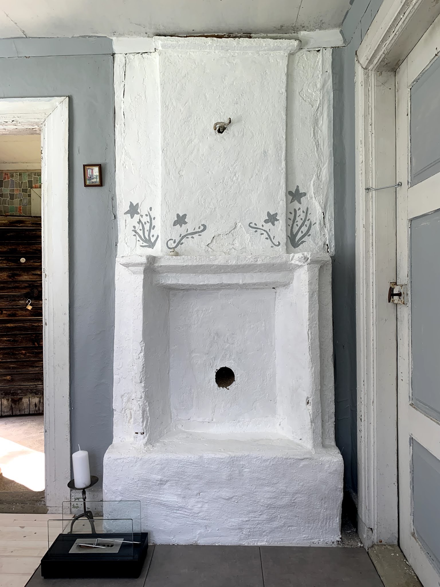 Someone with more skills than I would probably have put on new plaster and done a more proper job - and not painted flowers on it because it was fun - but it looks a lot better. And, this can be redone later. At some point in time I may bring someone in to look over all the fireplaces and see if we can get them going.