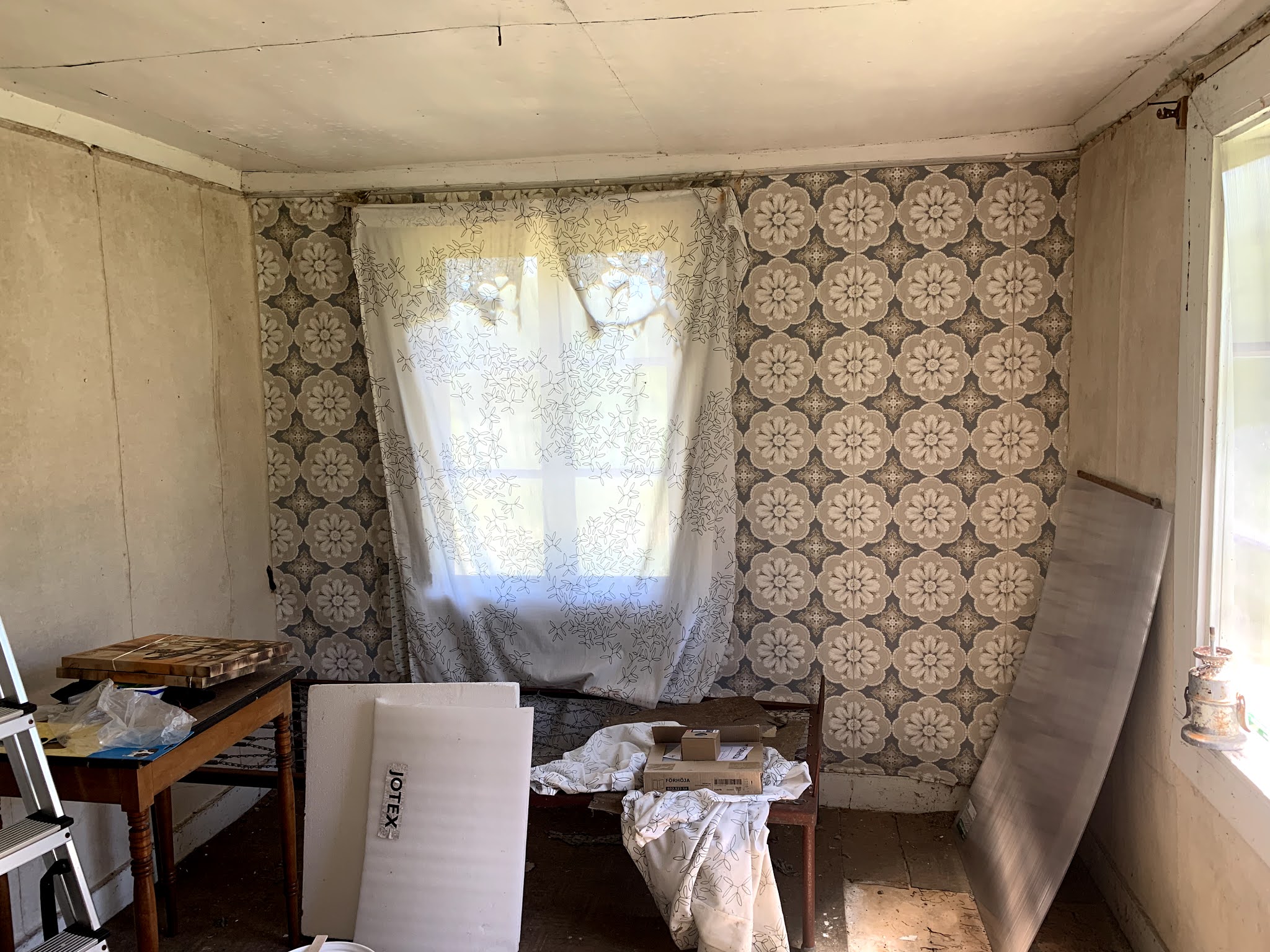 Before, there were holes in the floor - I made some more through stepping through it - water damage on a wall, and some really stinky old insulation.