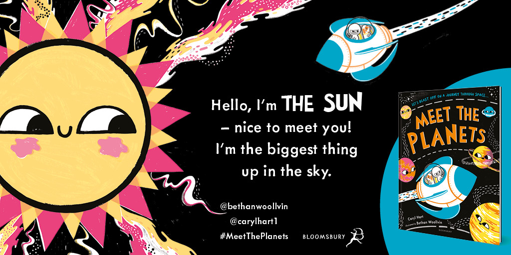 Me: The Meet the World series (as I like to call it) started life in 2016 after Emma Blackburn, our Editor at Bloomsbury, saw some animated gifs of planets with little faces that you had on your website.  She asked if I'd be interested in developing a rhyming book about a journey through space, with a rhyme for each planet, using your illustrations.