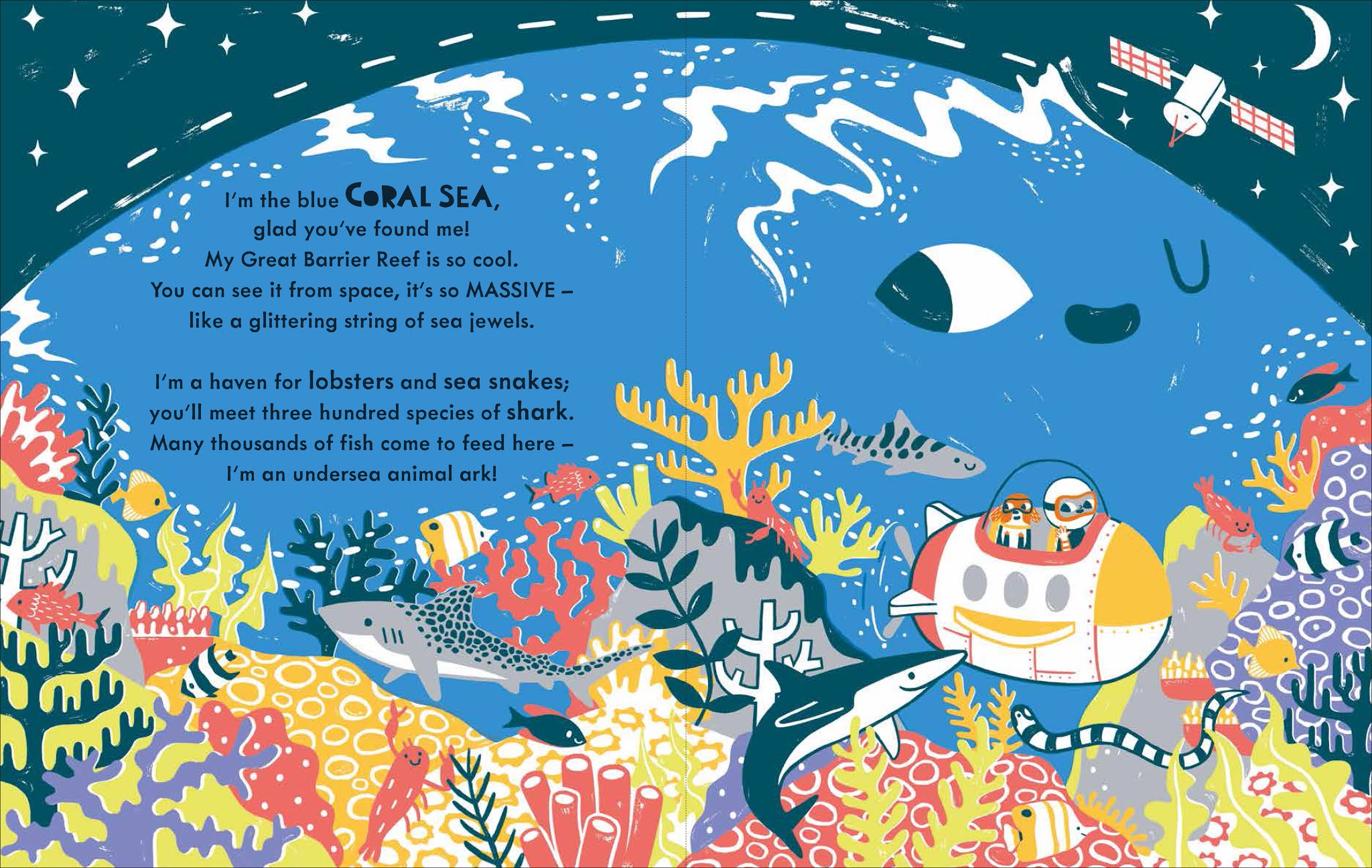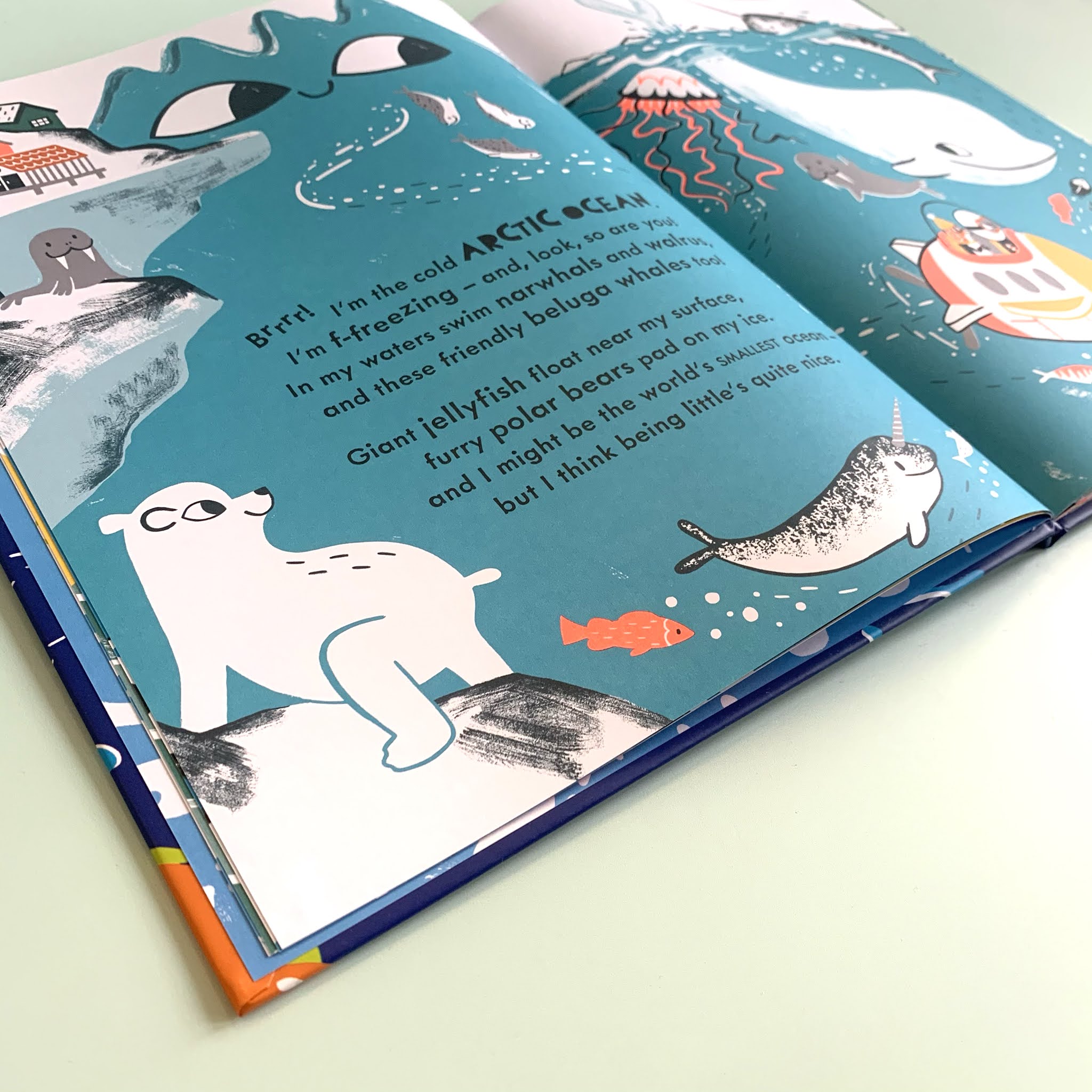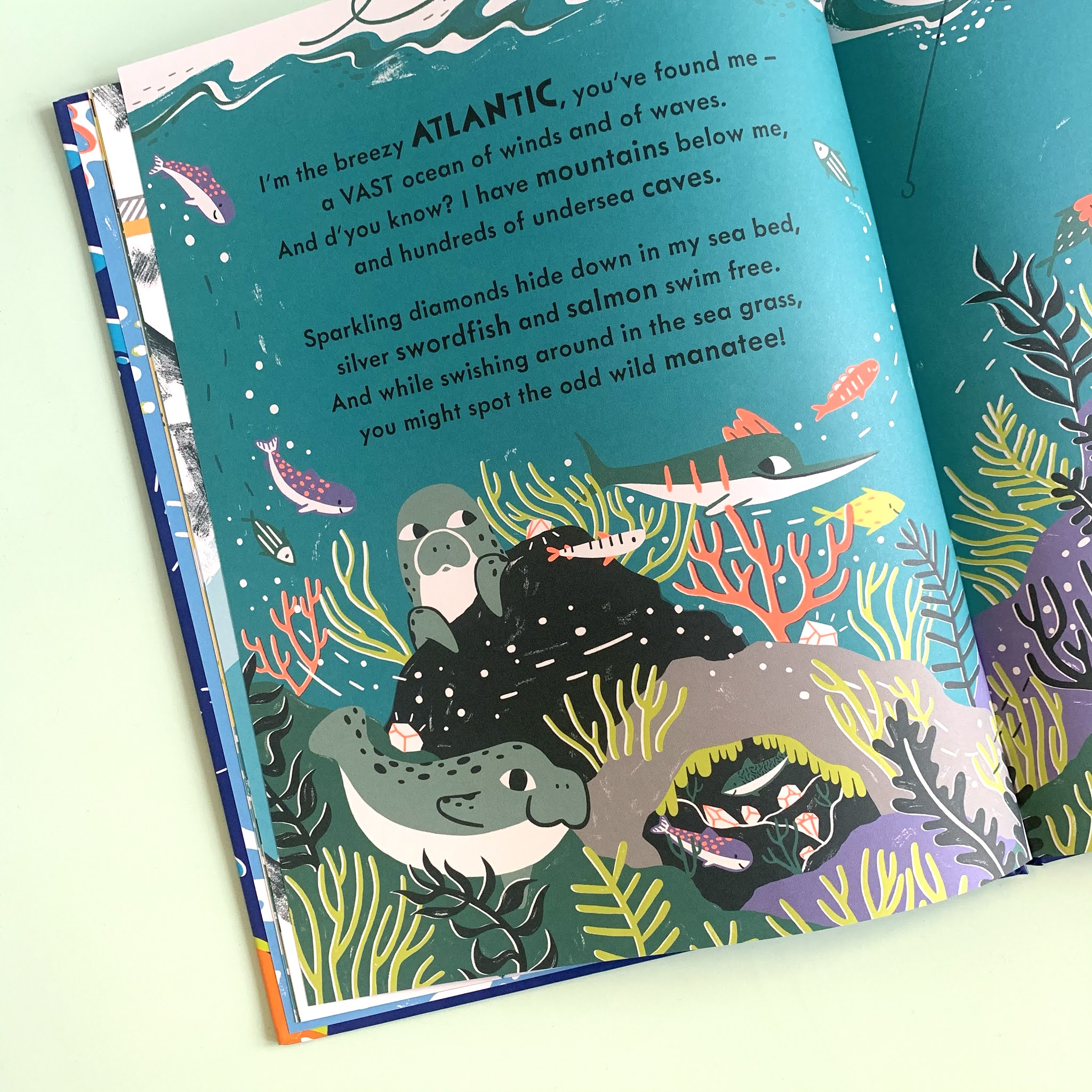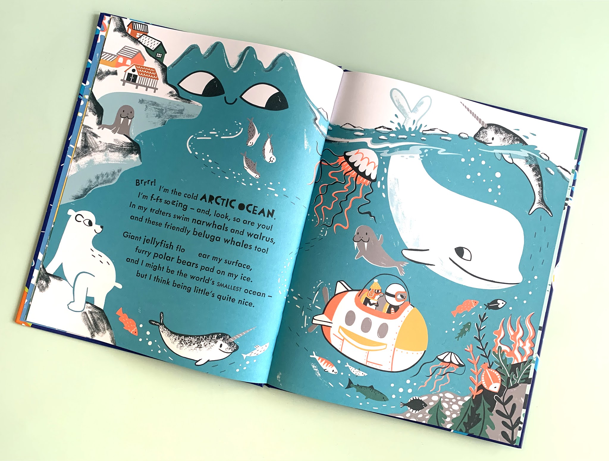 Me: Honestly, it was really hard! It took me a really long time to get every verse right. It was tricky finding words with the right number of syllables needed to keep the rhythm even and flowing. There was a lot of chopping and changing to get to the point of a first draft. And then lots of re-writing following our editor's and designer's comments. When you write in rhyme, changing one word can often lead to re-writing the whole verse! We were also very keen to ensure each page picked out different aspects of the oceans and seas we were describing without too much repetition.
