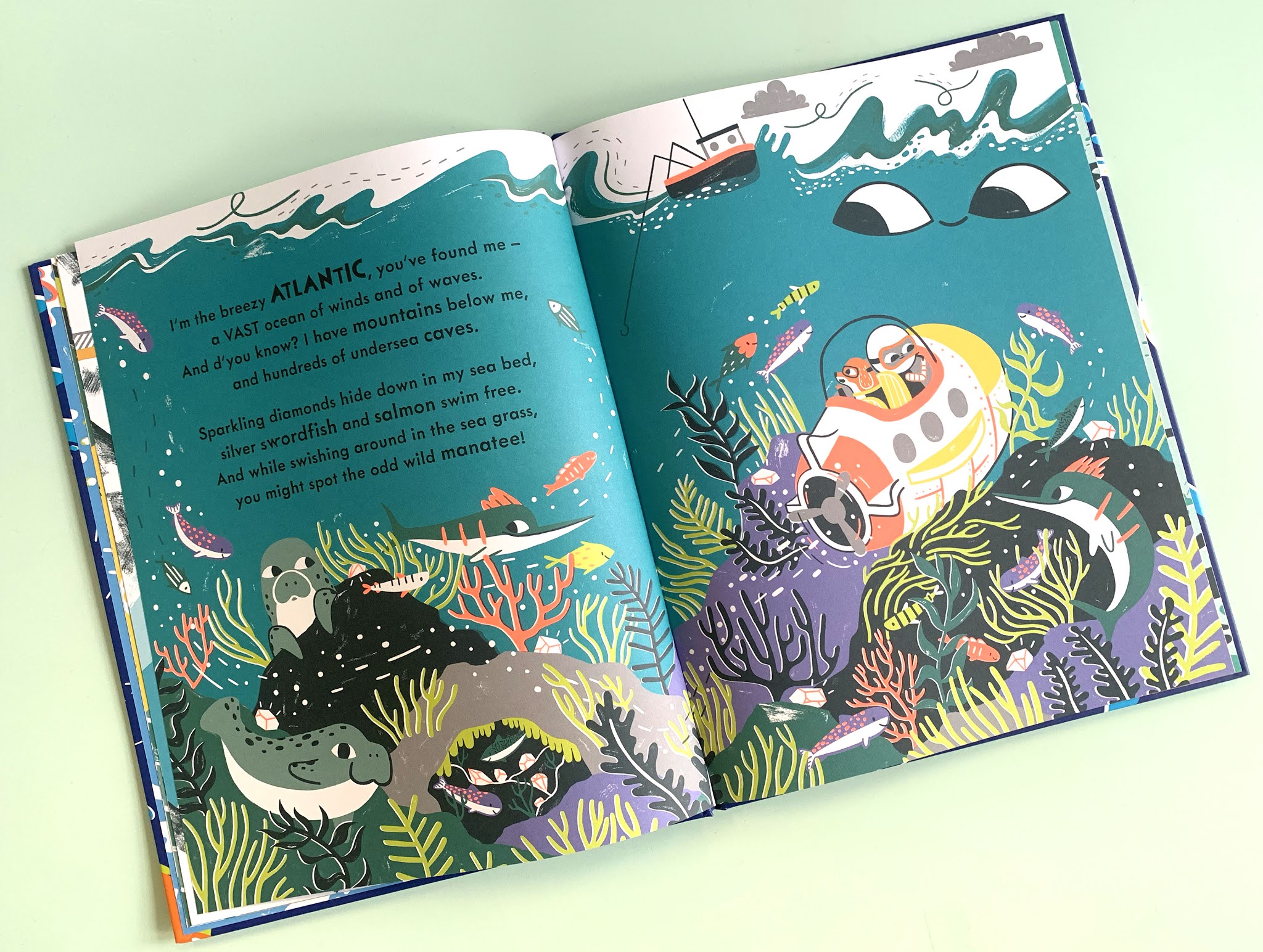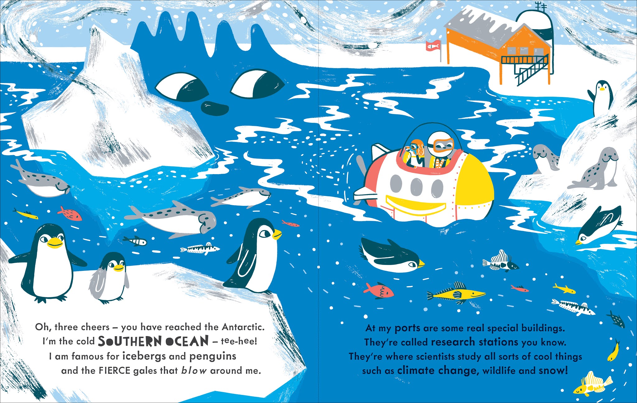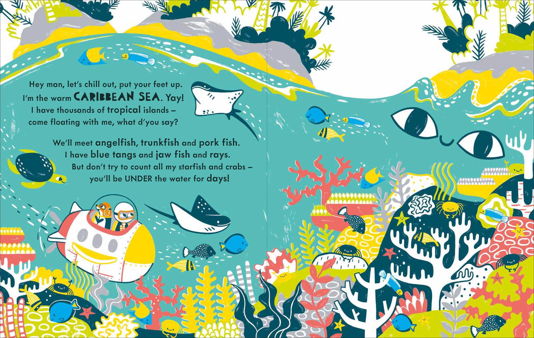 Me: I had no idea how you were going to illustrate bodies of salt water as characters but you've done an amazing job of giving them all personalities. You've put so much detail into each image, with dozens of cute sea creatures for readers to spot! I love also that not every illustration is just a view of the sea bed. Some include bits of shoreline and the wildlife that lives beside the sea as well as in it. The way you transition from what is above water to what is below, is really clever!