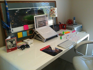 Im a very lucky girl. I have a study that was purpose built for me to write in. When we built the house it was one of the first things I asked for. The first photo shows my desk area. As you can see, I'm busy planning my goals for 2013 ~ with the use of multiple coloured highlighters, of course. I love them. I also like Post-Its, in case you hadn't noticed.Behind my laptop is a limited edition photo that I bought for Big G of our trip to the Rugby World Cup in 2003. It's a view of the 80,000+ crowd and we were in it! I can even see us!On the left are our season passes to the WEstern Force games. I look after them because Big G is hopeless at that sort of stuff.There's also a card from Princess ~very funny ~ and my Madonna D&G sunnies, plus my Shop-a-holic Day Planner.