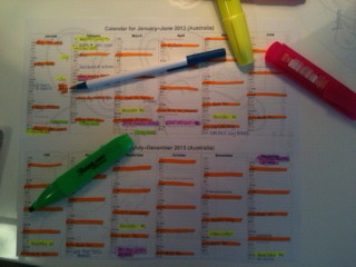 In my last post I told you about how I've decided to set a number of goals for myself this year and that to achieve them I have to break the tasks into manageable portions. Well, from the Year Planner I've devised ~ with help from free online calendars *wink* ~ it looks as if I'm set to have a very busy year. And I haven't even got to the working at home part yet ~ starting a chalet business!My Goals for this year are as follows ~I will reach my goal weight by the end of April. Unfortunately, my efforts with the 12 Week Body Transformation thus far have been pathetic. Though I thought I was doing everything right and have even begun to exercise again, it appears that I cannot move my weight!!! GRRR. Even after being careful and not drinking on NYE I still managed to put on a kilo!To achieve this, will mean writing down EVERYTHING though because I have a sneaking suspicion that even though I may have thought I was being good, I'm not. Either that or I just give up eating!I will publish a set of 3/4 novellas based around the holidays ~ Valentines, Easter, Christmas. This gives me a deadline for release as holidays/events never change! It also means I can book the marketing well in advance.I will publish two full length novels. One in June and the other in September. i would like to say 3 here but the goals have to be realistic and if I'm aiming for quality 2 is more realistic.By July, I will have a part-time tutoring business. I've already begun this process and have gone into partnership with another teacher. My aim is not not be in the classroom anymore as I want to be more flexible. Unfortunately, it means I will have to tutor on my day off and after school for the moment, but I figure that's a good way to see if I like it.The blog will get an upgrade. I want the blog to be more informative, fun and read by more people so I've devised a plan of attack here already (that's all the orange you can see in the photo). I'm going to have three regular posts on featured books/new releases, A pictorial post showing different authors writing spaces and another fun post for authors to write top 5 lists. Of course, I'll still be doing giveaways and telling you about my writing journey too. All the authors will be Chick Lit or Women's Fiction based and I hope the blog will become a really fun informative place for readers, as well as a promo opportunity for authors.By the end of 2013 I am going to be well on the way to running Writer's workshops and Retreats, Fitness Camps and Rustic Weddings from our home venue. At the moment this, is the hardest to achieve because of financial requirements. So the first thing I'll need to do is go with Big G and take a visit to the bank! Once the funding is organised, we can put some plans in place ~ and believe me we have a lot!!!