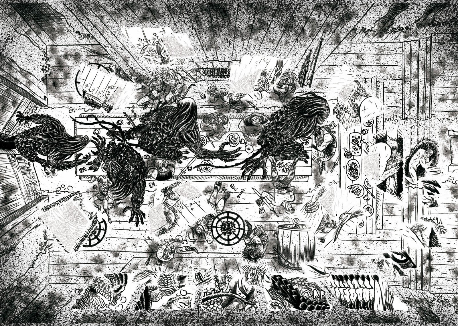 03-Tinta: En BEOWULF he usado diferentes técnicas de entintado, como se puede apreciar en esta página, primero sobre papel, con Pentel, pincel tradicional, pentels estropeados o gastados, rotuladores finos y, luego, una vez escaneado (a 600ppp), añadiendo retoques digitales como las salpicaduras -que son escaneos previos de manchurrones que hice salpicando tinta china con un cepillo de dientes sobre diferentes papeles- y que me ayudan a potenciar la atmósfera y las texturas de la página.