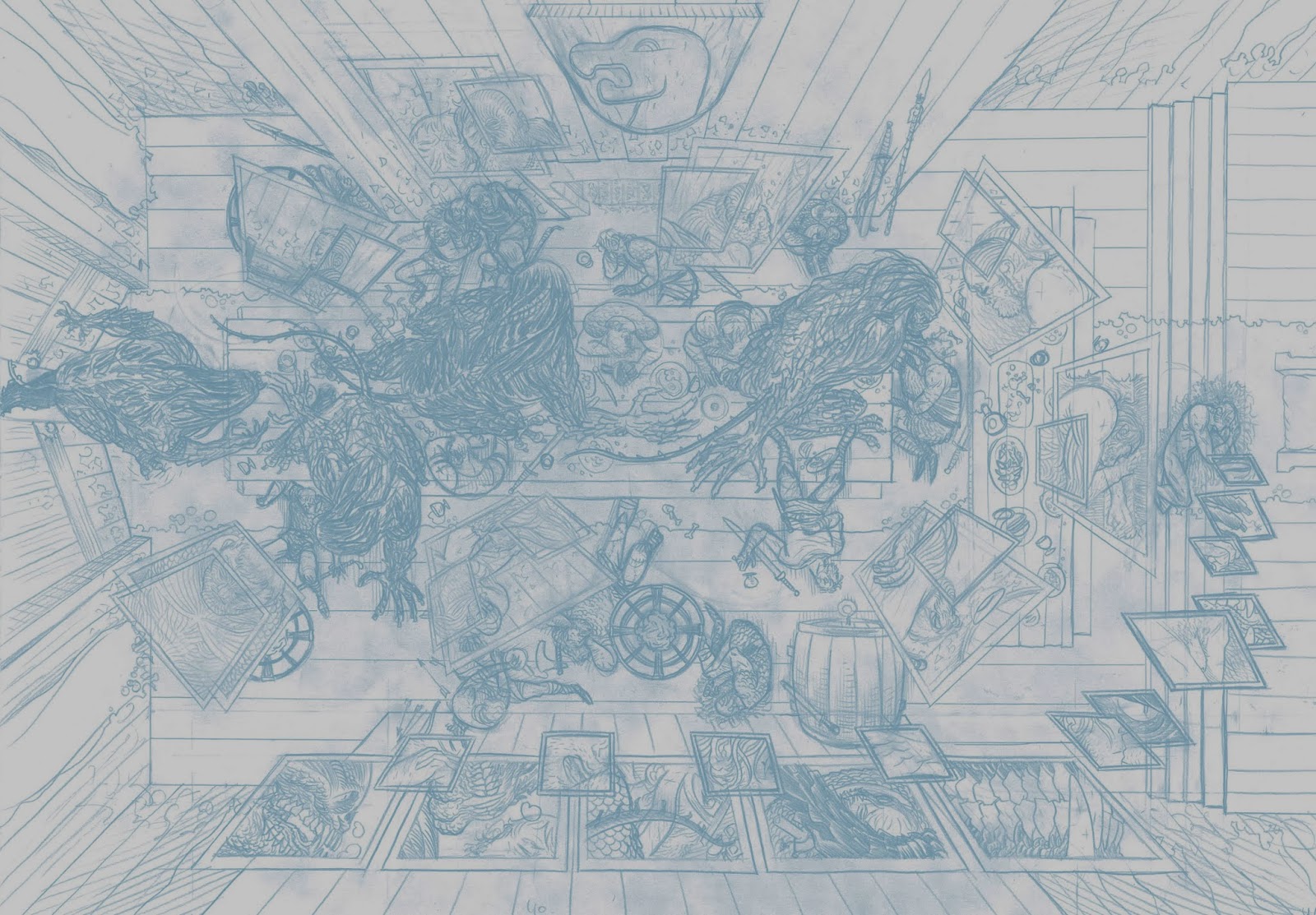Una vez terminado el dibujo a lápiz escaneo de nuevo la página y la imprimo en azul, pero esta vez en un papel de mayor tamaño (B4) y sobre esa impresión de los lápices entinto, definiéndolo todo, dándole peso y atmósfera a lo que acontece en las viñetas y corrigiendo con la tinta pequeños errores que haya cometido con el lápiz.
