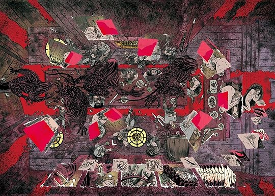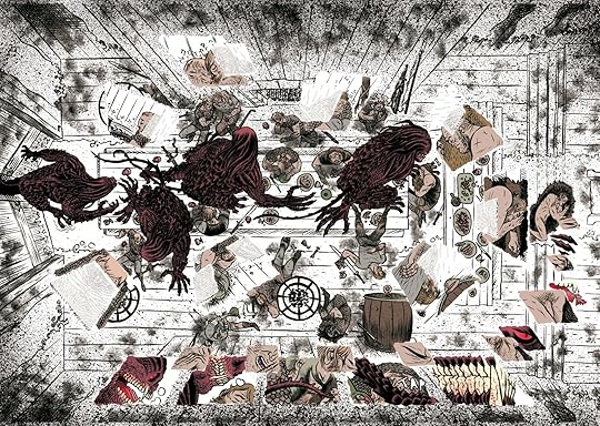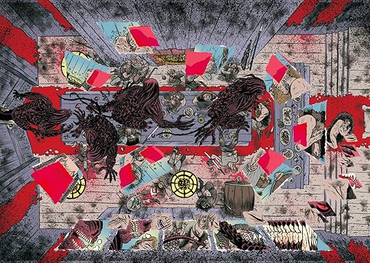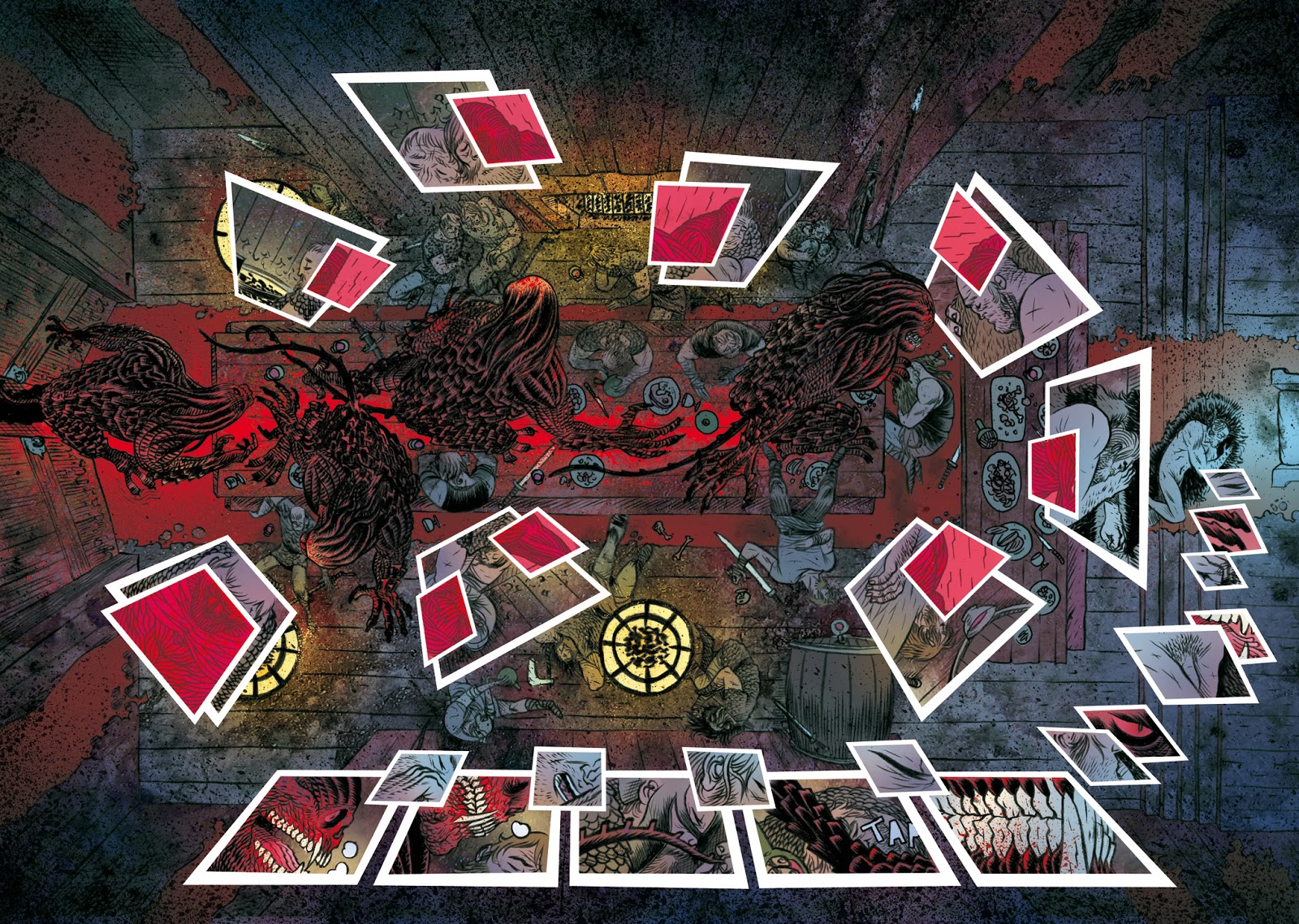 08-COLOR, paso 5: El resultado final. A lo mostrado antes añado capas de color para conseguir mayor atmósfera y efectos de luz, así como FX como el reguero de sangre que GRENDEL deja a lo largo de su recorrido por la estancia, que no solo ayuda a potenciar el impacto de la página, sino que le otorga de un modo subliminal mayor claridad a la misma al tiempo que ayuda a posicional aún más a Grendel como eje central de lo plasmado en la página.