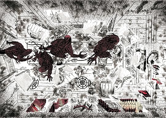 08-COLOR, paso 5: El resultado final. A lo mostrado antes añado capas de color para conseguir mayor atmósfera y efectos de luz, así como FX como el reguero de sangre que GRENDEL deja a lo largo de su recorrido por la estancia, que no solo ayuda a potenciar el impacto de la página, sino que le otorga de un modo subliminal mayor claridad a la misma al tiempo que ayuda a posicional aún más a Grendel como eje central de lo plasmado en la página.