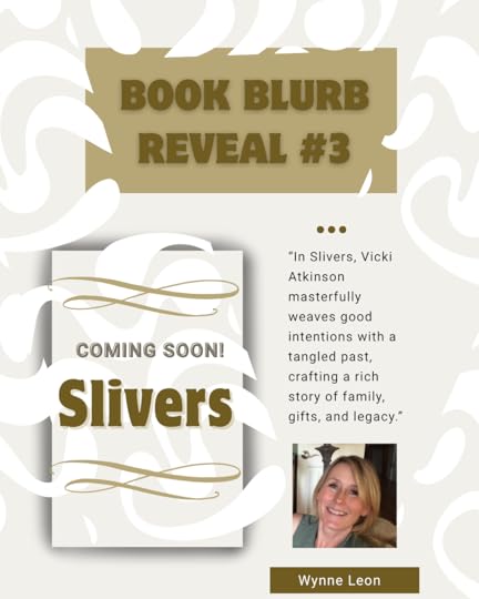 This week I offer the final “Slivers” Book Blurb, thanks to Wynne. She understood “Slivers” in its infancy and along with my dear friends Linda Frank and Kathleen Canfield, she read as I wrote — encouraging me to do the unthinkable: finish my first-ever novel.