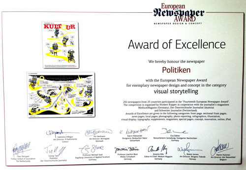 Det var en dejlig overraskelse, da Politikens Kultur-zar Kasper Steenbach forleden overbragte mig nyheden om, at min Jørgen Leth-extravaganza fra sidste år netop er blevet anerkendt som “Award of Excellence” til den store European Newspaper-kongres i Wien. Det er andet år i træk, anerkendelsen rammer et indslag produceret af mig, og det er jeg meget beæret over. Især fordi jeg i perioden kun har lavet to indslag, hvilket betyder… at der er 100% garanti for en fornem pris, hvis man bestiller et opslag eller en forside hos mig, hihi – køb, køb!