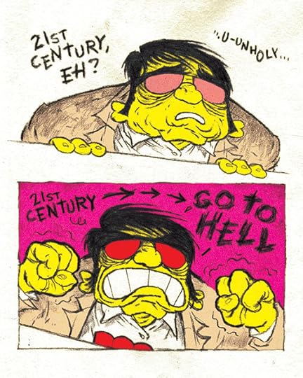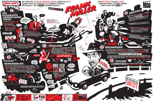 I dag pryder mine ydmyge streger hele to forsider af hæderspublikationen Politiken, samt midteropslaget i FILM&TV. Anledningen er at Frank Miller er tilbage med endnu en tvivlsom filmatisering om Sin City. Frank Miller er indiskutabelt en af de mest centrale nulevende tegneserietegnere (og -forfattere), og hans hovedværker – Daredevil: Born Again, The Dark Knight Returns og Batman: Year One – er stadig noget af det mest intelligente, originale og energiske tegnede fortællekunst fra Nordamerika, og har indlysende påvirket mig stærkt. Jeg blev spurgt om jeg kunne tænke mig at lave noget i forbindelse med dagens premiere på Sin City: A Dame to Kill For, og selvom jeg mildest talt har blandede følelser for Millers City-projekt sagde jeg naturligvis ja, for gammel kærlighed ruster som bekendt ikke.